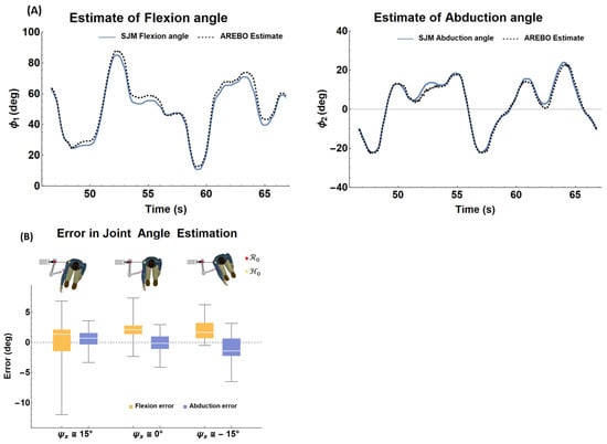 (A) Trajectories of the flexion angle ()/abduction angle () recorded in SJM (blue curve) and the estimate by AREBO (dashed black curve) for ~0 cases. (B) Boxplots of the errors in flexion and abduction angles estimated by AREBO while SJM was performing random polysine movements.