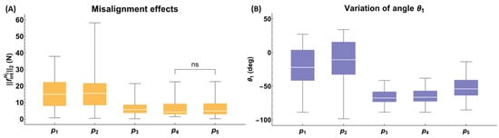 Effects of the position of the human joint on interaction forces. (A) Box plot of the interaction forces at various locations ( of SJM. (B) Variation of angle at various locations of SJM. ns—nonsignificant difference in one way ANOVA (p > 0.05).