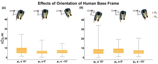 In the experiment on the effects of the orientation of the human base frame (Figure 16), the median value of the interaction force was similar in almost all cases, although the interaction forces at all the orientations were significantly different ( in oneway ANOVA). The spread of the interaction force values was slightly higher when the SJM was rotated towards the robot (, as seen in the two boxplots corresponding to different values of displacement along the y-axis of the robot’s base frame. The post hoc test with Bonferroni correction revealed that except for the two interaction forces at , all the other interaction forces were significantly different from each other.