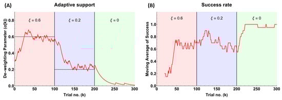 (A) Adaptation of the de-weighting parameter as a function of the trial number when operating the robot in adaptive weight support mode. The dotted lines are the weakness (ξ) set in SJM for the first 200 trials, after which the ‘no weakness’ case was simulated. (B) The success rate obtained from AREBO’s adaptive weight support algorithm. The vertical black line segments the plot into three segments to distinguish the 60%, 20%, and 0% weakness (ξ) simulated in the SJM for trials 0–100, 100–200, and 200–300, respectively.