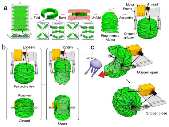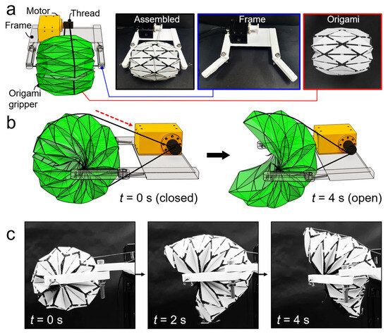 Fabrication of an origami-based soft encapsulating gripper. (a) Illustration of the complete structure of the origami-based soft encapsulating gripper, which consists of origami gripper, frame, and motor. (b) Schematic illustration and (c) digital photograph image of the operation of the origami-based soft encapsulating gripper.