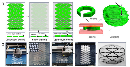 Fabrication of on-fabric 3D origami pattern with programmed folding. (a) Schematic illustration and (b) digital photograph image of each step of the fabrication of on-fabric 3D origami pattern with programmed folding.