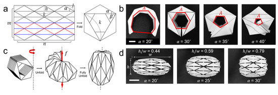 Specifically, as depicted in Figure 4b, A increased with the decrease α, while the area decreased with the increase in the α. The planar area when the α was 20° increased by 4.15 times compared to the area when the α was 30°. In order to do this, when the α is 35° and 40°, the planar area was reduced to 0.37 and 0.07 of the area with the α of 30°. In addition, when the α is more than 30°, the distal triangles overlap, hindering the folding process of the origami structure. Based on these results, we have set the α to less than 30°. Therefore, we fabricated 3D origami gripper structures with α < 30° in Figure 4d. Also, the length of the base (k) and height (h) of the triangle changes according to Equations (2) and (3).