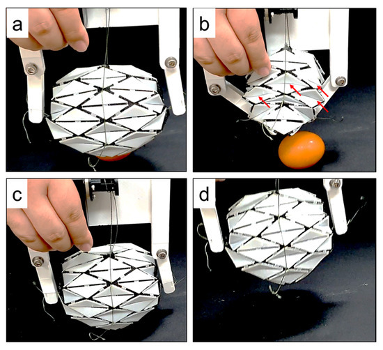 First, we experimented with picking up an egg with the gripper (Figure 6 and Video S2). For this experiment, we placed the egg on a table and moved the gripper near the egg. When the gripper was positioned near the egg, the motor rotated to pull the wire to open the gripper. When the egg was located in the center of the gripper, the motor rotated to release the wire. As the wire was released, the gripper unfolded, wrapping around the egg on the table and placing the target inside the gripper. This experiment confirmed that the wrapped eggs were picked up safely and neatly without any damage on the surface.