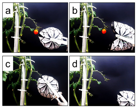 Origami-based soft encapsulating gripper Application 2: tomato harvesting. (a) Approach to the target (b) open gripper, (c) close and encapsulate and (d) harvest the target.