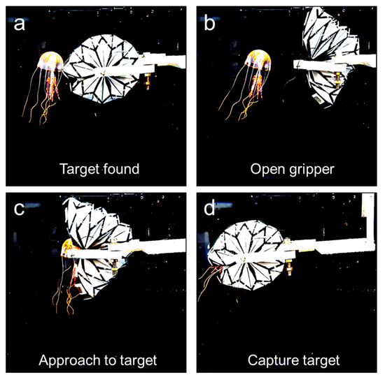 The last demonstration was capturing a silicone model jellyfish (Figure 8 and Video S4). For this experiment, silicone jellyfish were installed in an acrylic tank filled with water. In order to bring the target into the water, the motor frame was attached to a stage that could move in the x, y, and z axes. After setting the axes according to the target’s position, the gripper was moved, and when the gripper was located close to the jellyfish, the motor rotated to open the gripper and capture the silicone jellyfish. Although the legs did not completely enter the gripper, when we took the gripper out of the water and checked the captured object, we could confirm that it was captured intact and without damage.