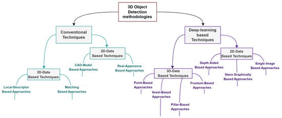 Convolution Neural Networks (CNNs) are commonly used in 3D object detection methodologies based on deep learning strategies to retrieve a hierarchical suite of abstracted features from each object in order to record the object’s essential information [66]. Unlike conventional 3D object detection techniques, which depend on hand-crafted feature descriptors, deep learning-based techniques utilize learnable weights that can be automatically tuned during the training phase [67]. Thus, these techniques provide more robustness against environmental variations. The deep learning techniques can also be categorized into 3D- and 2D-data-based techniques, as shown in Figure 1.