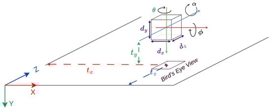 As Figure 2 shows the angles, dimensions, and translations on an object model, the 3D bounding box could be described by its dimensions D , center coordinates T , and orientation R , which are characterized by azimuth (), elevation (), and roll () angles. For the assumed case of a flat ground, and angles are safely considered zero. Moreover, by considering all the objects to be on the ground, it is also valid to fix the height of the object () to zero. Thus, it is sufficient to predict the Bird’s Eye View posture.