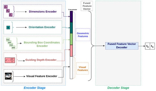 In this way, the above model depicted in Figure 8 accepts the full representative geometric-visual properties of the object and learns to predict the corresponding Bird’s Eye View bounding box center of the detected object. The full Bird’s Eye View center estimation model was trained on L2 Loss [124] to generate the translation loss (), as the explanation provided in Equation (7):