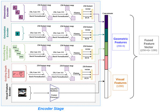 As detailed in Figure 9, the Bird’s Eye View Center Estimator encoder stage is composed of five major branches, each branch acts as an encoder to its input feature. The visual feature encoder branch accepts image crops of vehicles detected in the frontal camera view as input, then extracts deep representations using the GhostNet network. This part of the model can extract semantic features from input images despite not knowing where the bounding box is in the scene. It generates a 1280 element feature vector. Each of the remaining four encoder branches generates a 256 element feature vector.