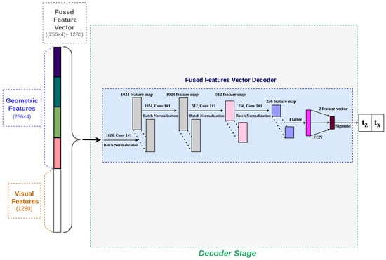 The four encoded feature vectors in addition to the GhostNet extracted features of Figure 8 are concatenated to generate one geometric-visual fused feature vector of size (256 × 4 + 1280 = 2304) elements and fed to the decoder network which estimates the center coordinate (,) of the Bird’s Eye View bounding box, as shown in Figure 11.