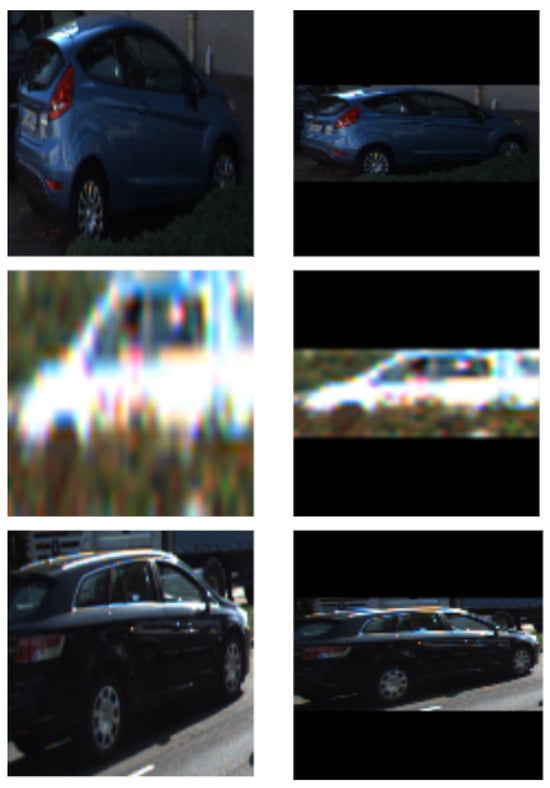 Figure 4 illustrates an instance of a vehicle crossing the road. The vehicle’s global direction does not alter, but its local direction which is estimated depending on the appearance of the vehicle in the 2D bounding box is changed. Thus, the global direction is calculated by adding the change in the local direction with respect to , which represents the ray traversing the center of the cropped bounding box originating from the camera center. Since the direction of a ray at a given pixel can be easily calculated given intrinsic camera parameters, it is crucial to estimate the local orientation using the 2D bounding box’s extracted features. Then, by adding the estimated local orientation and the ray direction to the center of the observed 2D bounding box , the object’s global orientation is calculated.