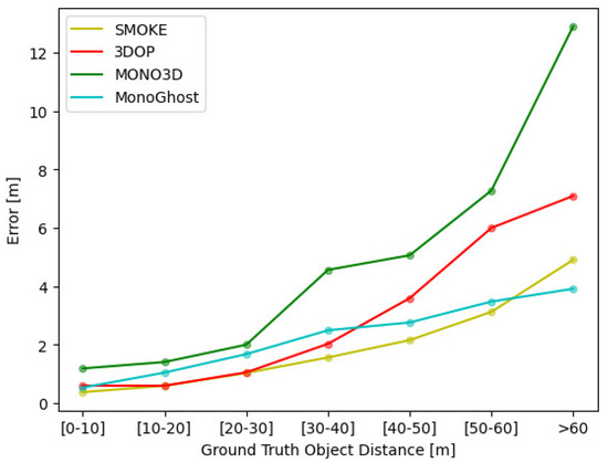 The experimental work of the proposed MonoGhost network, which explains the implementation details, the utilized dataset for training and benchmarking, and the training procedures, is discussed in Section 4. The success of the proposed network architecture is verified by experimental results on KITTI Bird’s Eye View benchmark (https://www.cvlibs.net/datasets/kitti/eval_object.php?obj_benchmark=bev, accessed on 5 November 2023). It is compared to the most effective monocular 3D object identification methods currently available like PGD-FCOS3D [23], KM3D-Net [24], and SMOKE [25], as addressed in Section 5. Conclusions are presented in the final section of the paper.