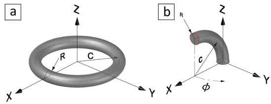 Torus geometry in the Euclidean space where (a) shows a full torus radially symmetric about the , and (b) shows a toric segment moved and rotated to represent a PCC soft actuator.