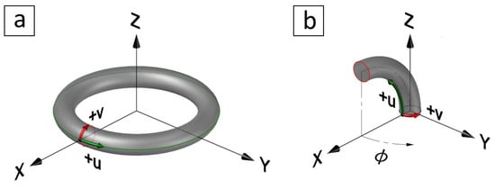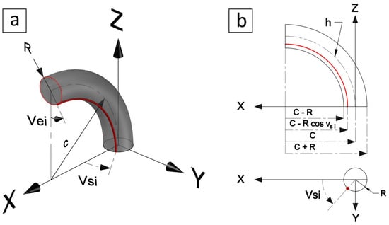 However, there is a difference between T and in the location and direction of the coordinates with respect to the Euclidean origin . The torus T is transformed by rotating around the x- and axes, then shifting by , and also by transforming v to start from and rotating anticlockwise around the centreline, i.e., around the at the base, as shown in Figure 3b, by substituting in (3). The result is a parameterisation equation of the toric segment as a surface of revolution at as follows