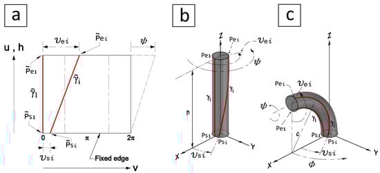 A soft sensor can be attached to the surface of the soft actuator [55] as shown in Figure 4. As described above, a toric segment with is a vertical cylinder and can be represented as a plane in a planar space, Figure 4a, which has v as its horizontal axis and u (or h) as its vertical axis. Keeping in mind that h is just a special case of u when .