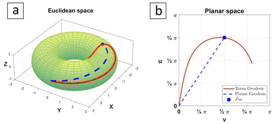 To understand the difference between planar and Euclidean spaces’ geodesics, we have marked a point on a torus surface, Figure 5a, and calculated a geodesic curve [56] starting from the origin and passing through . This curve is lifted to a planar space, Figure 5b, that has a straight line as its geodesic path connecting between the origin and a lifted point . This straight line is mapped to the torus surface in the Euclidean space as well. The difference between the two paths is obvious and proves that a straight line in the planar space is not necessarily mapped as a geodesic curve on the torus surface. Based on that, geodesic theory alone is not enough to derive a mathematical model for the sensor path in Euclidean space. Since the torus is considered a Riemannian manifold, the concepts of both the geodesic theory and covering spaces should be used for mapping the planar space to the Euclidean space.