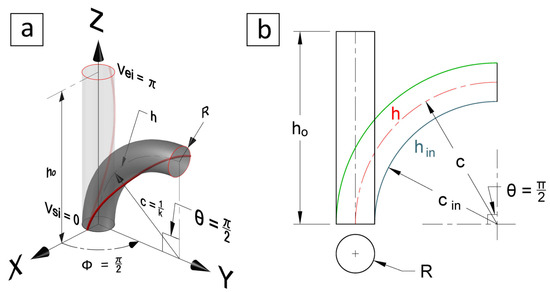 Case study 4, bending and rotation, where (a) shows a 3D view, and (b) shows the initial , the centreline h, and the inner surface lengths.