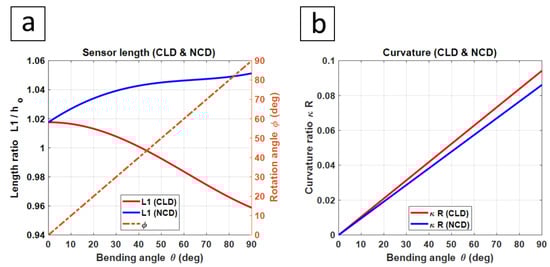 Case study 4, where (a) shows the sensor length and rotation angle , and (b) shows the actuator curvature. Both plots are against bending angle and for CLD and NCD designs.