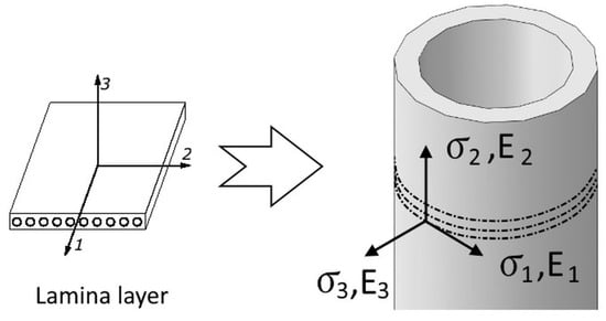 The proposed reinforcement model allows a longitudinal expansion while limiting the radial expansion of pneumatic muscle due to the difference in Young’s moduli, Figure 11. The general stress–strain relation for a material having an orthotropic symmetry is [63]