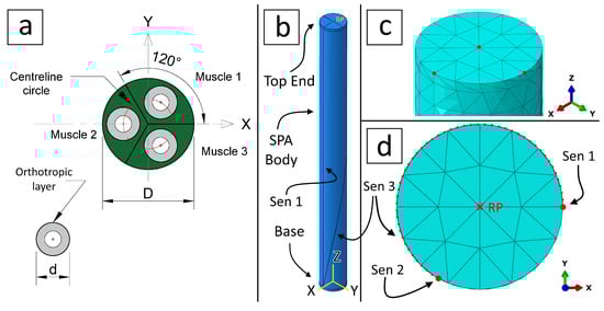 The SPA consists of three parts, two stainless steel discs, base and top end with a mm thickness each, and a silicone body with a height of mm, as shown in Figure 12b. The stainless steel has a density of 7930 Kg/m, a Young’s modulus GPa, and a Poisson’s ratio . The base was fixed, and the top end was free to move and rotate in all directions. In Abaqus, the STRI65 element type was used to model the orthotropic layer. It is a 6-node triangular thin shell element, using five degrees of freedom per node. Similarly, the C3D10HS element type was used to model the silicone and stainless steel parts. This element type is a 10-node general-purpose quadratic tetrahedron with improved surface stress visualisation.