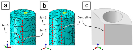 Assuming a linear material behaviour, the elastic properties , , and are constants. Only four independent elastic properties are required due to the symmetry of the compliance matrix in (24), which are , , , and . However, the shear moduli and are also required for modelling the transverse shear deformation (if any) in Abaqus. We selected the elastic properties of our reinforcement layer to be based on PET [49] with a density of 1350 kg/m, a Young’s modulus GPa, and a Poisson’s ratio . The remaining elastic properties are discussed below. To simulate the reinforcement layer as orthotropic in Abaqus, we used a lamina elastic model that requires the following conditions for material stability in plane stress