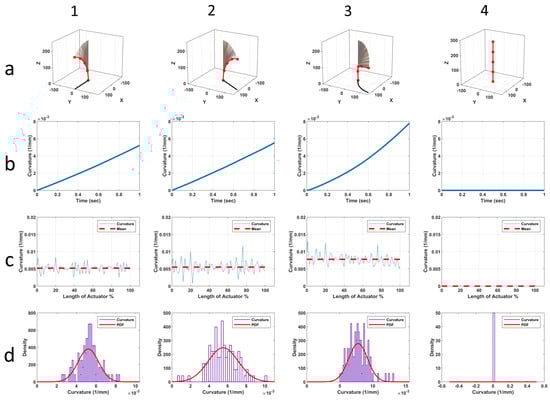 The soft actuator starts from the initial position and bends till the top face makes a right angle with the base plane. Also, the soft actuator rotates around the till simultaneously, as shown in Figure 8a,b. There is no twisting, , and the actuator dimensions were selected randomly to have a straight position length of = 250 mm and an actuator radius of R = 15 mm. Here, we show two options for the soft actuator design that behave differently under this bending scenario. First, the centreline length is constant (CLD) [27,58,59] in which and the inner surface of the toric segment is compressed, i.e., . Second, there is no compression [3,42,60] in the inner surface (NCD), in which and the centreline length is extending to accommodate the difference, i.e., .