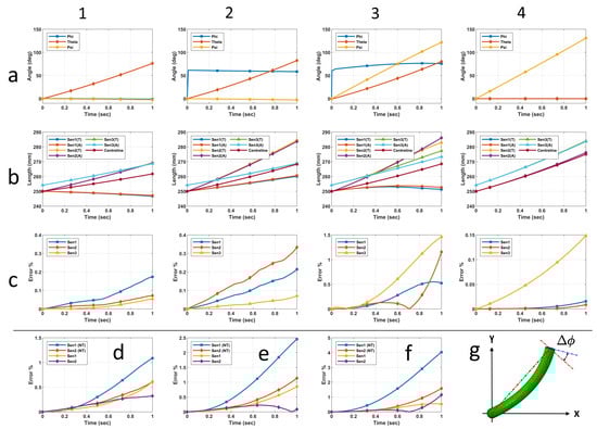 The soft actuator is under bending in the plane with no twist, i.e., , and the soft sensor is attached vertically onto the surface, i.e., , as shown in Figure 7a,b. Substituting in (18) gives