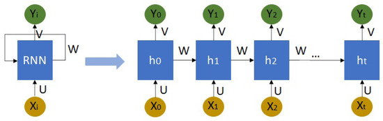 When mentioning RNNs, we refer to neural architectures for processing sequential data and time series usually encountered in tasks, such as bitcoin price prediction [124], speech recognition [125], and machine translation [126]. It is worth noting that implementing RNNs in problems related to natural language processing (NLP) leads to improved results compared to CNNs in most cases [127]. Concerning their functionality and compared to other types of networks (e.g., the multilayer perceptron (MLP) and CNN, which map a given input representation to an output vector), an RNN can estimate an output vector taking into account the entire history of a sequence of previous inputs [128]. To achieve this, the concept of using memory inside the network’s cells is introduced, indicating that the hidden state of a layer passes to the state of the same layer for the next time step (see Figure 1). In each time step, Equations (4) and (5) are applied in the hidden state and the output, respectively, to estimate their current values. Therefore, we calculate: