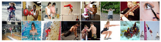 It is widely known that the utilization of previously trained networks curtails the duration of the training procedure, and higher performance is usually achieved. Hence, transfer learning constitutes a vital process in human action recognition pipelines, mainly when applied in small datasets (e.g., HMDB51 and UCF101). For instance, ImageNet, one of the most extensive static-image datasets containing more than 1.2 million samples for 1000 classes, is a widely adopted dataset for developing previously trained models. However, most target classes of ImageNet, such as “flowers”, “animals”, and “foods,” are irrelevant to the human activity classes, like “push-ups”, “dribbling”, or “pick-up” (see Figure 2). On the contrary, BU101 is a set of data from the web containing static images that depict a human action, as shown in Figure 3, and has been widely used to enhance the performance of activity identification in video sequences [64,131,134,135].