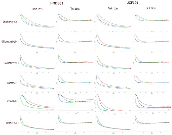 Train and test losses for ShuffleNet-v2 [49], EfficientNet-b0 [52], MobileNet-v3 [53], GhostNet [53], EVA-02-Ti [82], and ResNet-50 [43] on the HMDB51 [84] and UCF101 [85] datasets across epochs. In each diagram, four colours are depicted. The red represents the models previously trained on ImageNet [44,45] with on the dropout layer [130], black represents the models previously trained on ImageNet+BU101 [131] with on the dropout layer, green represents the models previously trained on ImageNet with on the dropout layer, and blue represents the models previously trained on ImageNet+BU101 with on the dropout layer.