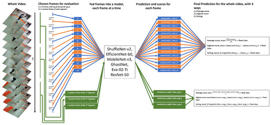 The final predictions generated through the sampled frames of each video are fed into the networks, as well as their corresponding scores (i.e., average, maximum, and voting). In addition, the feature vectors extracted by the CNNs and tiny ViT are fed into the RNN architectures to test the performance for the exact frames when the sequential property is exploited.