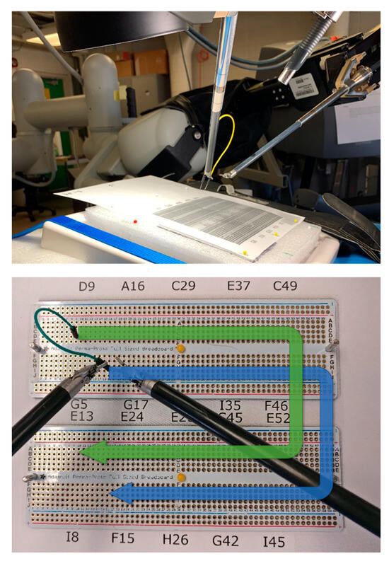 For the task mentioned previously, we used two printed images displaying circuit breadboards. The task entailed the precise placement of cable ends into designated holes on these two boards, as illustrated in Figure 3. The procedure required participants to transition the wire from their left hand to their right hand and then insert it into a predefined hole on the breadboard indicated in the task sheet (e.g., G17) using specialized tools. This process necessitated the navigation of the wire around the breadboard, guided by the coordinates provided on the task sheet. This particular task was chosen due to its significant camera movement requirements and its similarity to suturing motions, while being more accessible in terms of the learning curve. Participants were instructed to conduct a preliminary five-minute practice run followed by ten separate three-minute trials, each featuring a random arrangement of ten distinct patterns. The camera control methods were counterbalanced and rotated between the two test conditions—VACC and HOCC.