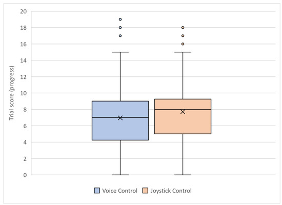 Task completion was quantified via the scoring metric described in Section 2.4.1. As previously mentioned, the scores for each method were compared and are visually presented in Figure 4. The average score for the voice-enabled camera control algorithm was found to be 6.96, while the average score for the human-operated camera control system was found to be 7.71. The p-value for this analysis was found to be 0.044, suggesting that there is a statistically significant difference in task completion between the two camera control methods. Based on these data, HOCC performed slightly better on average, compared to VACC. The number of tears/rips in the paper used by the subjects as part of the study was also recorded as a measure of the performance of the two camera control methods: 87 for VACC and 71 for HOCC. The p-value was found to be 0.29, which suggests that the difference (although higher for HOCC) in the number of tears between the two camera control methods is not statistically significant.