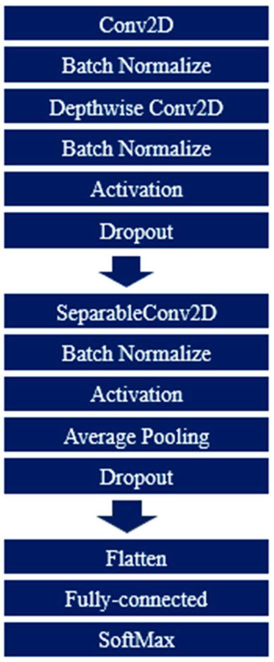 - Lawhern, V.J.; Solon, A.J.; Waytowich, N.R.; Gordon, S.M.; Hung, C.P.; Lance, B.J. EEGNet: A compact convolutional neural network for EEG-based brain–computer interfaces. J. Neural Eng. 2018, 15, 056013. [Google Scholar] [CrossRef] [PubMed]