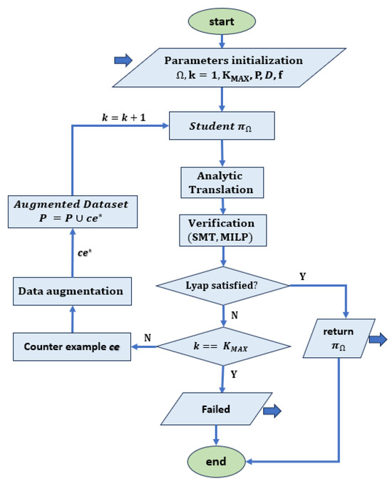 Flow chart for supervised learning with counterexamples. Given an initial domain D and a system f, a student network representing the Lyapunov candidate is trained using P samples from D. At each iteration, the neural network is translated into an analytic form and sent as input to an optimizer that checks the Lyapunov constraints. If they are not satisfied, a counterexample that violates the constraints is returned. This is used to generate a set of counterexamples that are included in the original data set D to obtain an augmented data set . If the Lyapunov function conditions are not satisfied, as described in [32,34], the training is terminated when the maximum number of iterations is reached without a solution being found, while the algorithm in [30,31] offers the possibility to reduce the search domain and repeat the learning procedure.