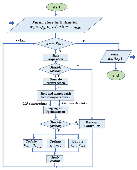 Figure 3. Flow chart related to the SAC algorithm, based on [40]. After initializing all networks, the neural controller , the Lyapunov function , the action-value networks with i = {1,2}, the Lagrange multipliers and , and the coefficient , the system applies a control signal and receives feedback, including reward and cost. The received transitions are stored in the replay buffer R and a set of transition pairs is randomly selected to construct the CBF and CLF constraints with the system f. These constraints are then used in RL controller training, where the extended Lagrangian method is used to update the parameters. If the safety and stability constraints are not satisfied, an optimal backup QP controller is designed to maintain basic safety.