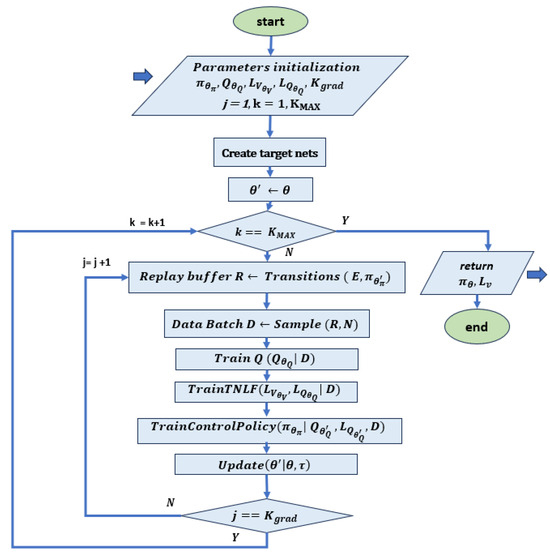 Figure 4. Flow chart related to the DDPG algorithm, based on [44]. This implementation is based on a co-learning framework where TNLF is trained together with the controller. The learning is based on the policy network , the Q-function network , their target networks and , the Lyapunov function network and the Lyapunov Q-function network . This acts as an additional critic for the actions of the actor, which is guided by its target network . The target networks are slowly changing networks that should follow the main value networks. After initializing the parameters, the transitions are sampled with the target network and the results are stored in the playback buffer R. This is normally used in RL to store the trajectories of experiences when executing a policy in an environment. Successively, the Q-net, the Lyapunov net and the respective target nets are trained on dataset D extracted from R. At the end of each step, the target networks are updated.