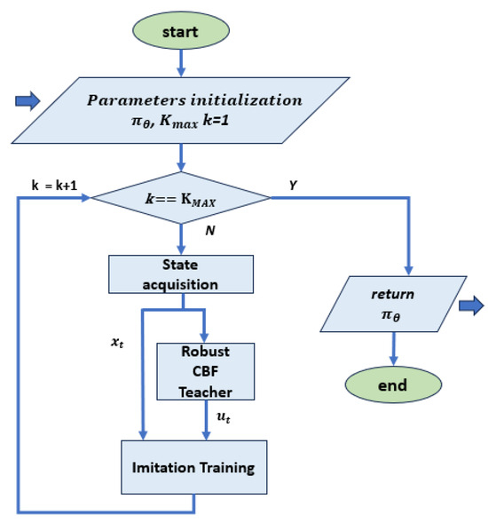 Figure 5. Flow chart for training with imitation learning, based on [35,37]. At each step, pairs of state values and control actions of the teacher controller are passed to the imitation training block as a reference. In this implementation, the teacher controller is based on an optimal controller that meets the safety conditions, so no further optimization block is required.