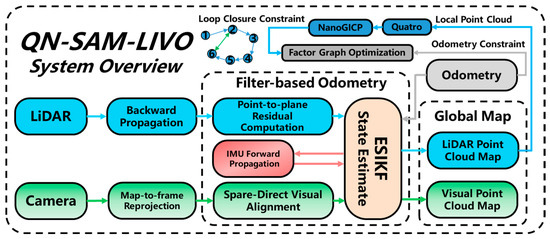 Furthermore, the growing focus on the robustness of three-sensor tightly coupled LVI systems in degraded situations has led to increased research attention in this field. Optimization-based methods tightly integrate the error models of individual sensors, reducing sensitivity to time synchronization through local maps or sliding windows. GR-Fusion [23], built upon a foundational factor graph optimization system, tightly couples local constraints with GNSS constraints, allowing real-time detection of sensor degradation and suitability for various scenarios. LVIO-Fusion [24] employs a similar architecture, introducing reinforcement learning to adaptively adjust sensor weights in different scenes. Incorporating deep learning into tightly coupled VIO systems for dynamic object recognition and dynamic impact elimination also enhances the SLAM system’s capabilities in dynamic scenes [25,26]. LVI-SAM [27] uses the concept of treating LIO and VIO as subsystems, ensuring continued operation if either subsystem fails or jointly working when a sufficient number of features are detected. Filter-based methods use only the current frame’s sensor data, offering relatively lower computational complexity and good scalability. Yang [28] couples visual point features within a certain distance range and IMU measurements tightly using MSCKF, retaining plane feature constraints in the state vector. FAST-LIVO [29] uses the error state iterative Kalman filter (ESIKF) [30,31] for multi-sensor fusion state estimation. LIC-Fusion [32] utilizes the multi-state constraint Kalman filter (MSCKF) fusion framework, tightly combining IMU measurements, extracted LIDAR edge features, and sparse visual features. Subsequent work introduces a sliding window-based plane feature tracking method [33]. R2LIVE [34] similarly uses an ESIKF for state estimation and low-frequency factor graphs to optimize the VIO system.