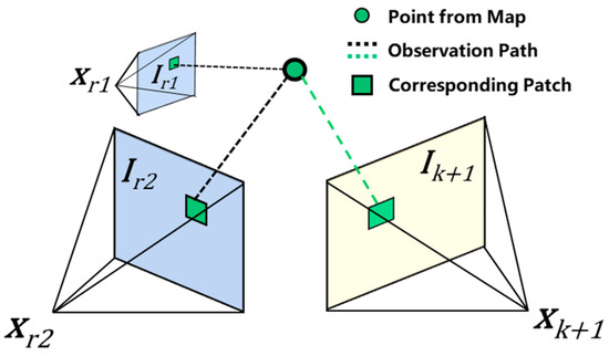 In processing visual data, this paper employs a sparse direct matching method based on [5] that does not rely on visual features. This approach omits the conventional VIO stages of visual feature extraction and depth estimation. Instead, it directly utilizes the visual intensity point cloud from camera-observed patches for the matching and tracking processes, yielding motion state estimation results between visual images, as schematically shown in Figure 2.