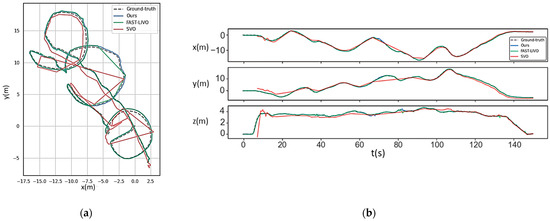 The evaluative framework involves a comparative analysis of our proposed methodology against several open-source odometry systems, which include FAST-LIVO [29]—a tightly coupled LIDAR-inertial-visual odometry employing a direct method. Additionally, R2LIVE [34], characterized by feature-based full LIDAR-inertial-visual odometry, SVO2.0 [40], a semi-direct visual-inertial odometry, and DVL-SLAM [41], a direct LIDAR-visual SLAM system, are included in the comparative assessment. All systems were downloaded from their GitHub repositories. R2LIVE and DVL-SLAM used the recommended outdoor parameters. SVO2.0 parameters were tuned for optimal results. The control experiment used the same DVL-SLAM version as FAST-LIVO, maintaining sliding window optimization for accuracy. Our reason for not discussing the excellent multi-sensor solution LVI-SAM in this paper is that it requires a nine-axis IMU as a data input.