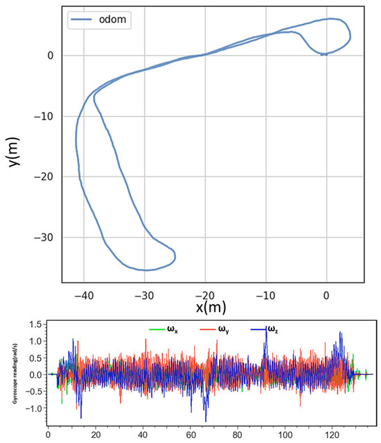 The upper panel illustrates a trajectory schematic of our proprietary dataset, while the lower panel depicts the corresponding gyroscope-measured angular velocity over time.