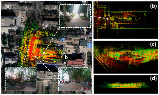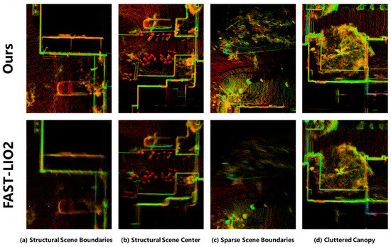 In the context of point cloud details, we conducted an exhaustive comparative analysis between our algorithm and FAST-LIO2 across various categories of point cloud details, as elucidated in Figure 11. In Figure 11a,b, depicting structured scenes at the edges and center, our algorithm captures detailed features, while FAST-LIO2 exhibits incorrect artifacts due to rotational scale drift, particularly evident around the depicted vehicle. Figure 11c highlights clearer boundaries in our algorithm with fewer point clouds, despite noise introduced by dynamic objects. Nonetheless, the presence of dynamic elements such as people and bicycles introduces some noise points, particularly noticeable around the image center. In Figure 11d, the central display highlights the point cloud corresponding to the canopy of a tree within the scene. A comparative assessment underscores that our algorithm’s point cloud map distinctly delineates the boundaries between the tree trunk and the canopy. Even from a top view, the discernibility of the tree and surrounding structures is evident.
