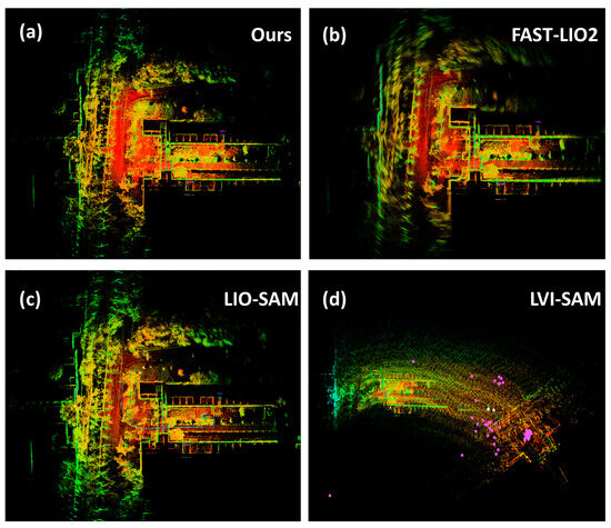 (a) The 3D mapping results of our method, FAST-LIO2 (b), LIO-SAM (c), and LVI-SAM (d) mapped onto our dataset. The point clouds are colored based on intensity.