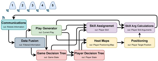 Figure 5 represents the strategy architecture schematic used to implement the Play Generator, as well as the decision trees [19,20] and heat maps [21]. The most important modules are explained in the following sections. The schematic is also color-coded. The data fusion module, represented in dark blue, filters all the information gathered by the robots, creating a real-time world state map used throughout the strategy. The decision trees in red are responsible for part of the decision-making, both for the game and the player’s decision trees. The Play Generator, shown in green, computes the optimal play for the current state of the game. Positioning and movement calculations fall within the purview of the heat maps and positioning modules, which are indicated in yellow. The two modules in purple, not discussed in this paper, are tasked with assembling the information, calculating the necessary arguments for packets, and transmitting them to the communication modules [22], thereby ensuring synchrony among the robots.