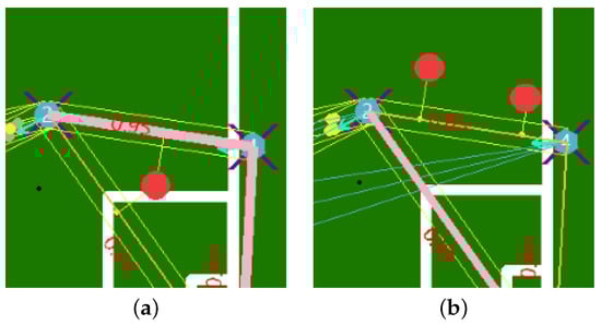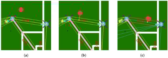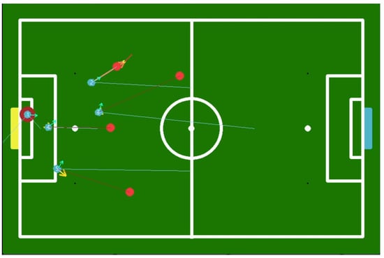 The Equation (2) is based on a Bayesian curve [12,24]. The opponent’s influence is applied by a multiplication factor based on the distance between the opponents and the line of pass being calculated, as shown in Equation (3). This influence is only calculated if the opponent robot is between the robots being analyzed and with a distance to the line of pass smaller than . Figure 6a shows an opponent affecting two lines, one of pass and one of goal, and Figure 6b shows an example of a line of pass being influenced by two opponents.