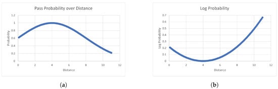 Log probability conversion: (a) Pass probability over distance. (b) Log probability of pass over distance.