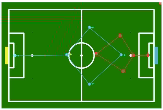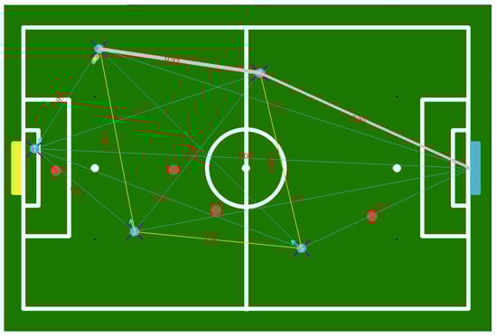 The calculation of the shortest distance (highest probability path) is based on the pathfinder algorithm A* [28,29]. The input to the algorithm is the starting and ending nodes, and these are always the robot that has the ball and the goal node, respectively. The output is the order of nodes that make the highest probability path. The A* algorithm applied to this strategy outputs the highest probability path of scoring a goal given the current game situation and ball handler. A* algorithm runs at every planning iteration and outputs the set of actions that maximizes the probability of scoring a goal. When the overall probability is low, the kicking skill is delayed as much as possible in order to give the team more opportunities to find a better set of actions.