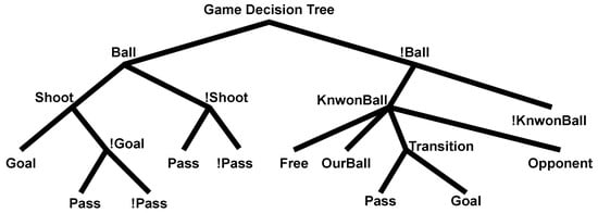 Probability-based plays cover the path desired for the ball in offensive situations, but something needs to decide what type of situation the game and each of the robots are in at every moment. This is where decision trees come into place, and for this strategy, there are two of them [19,20].